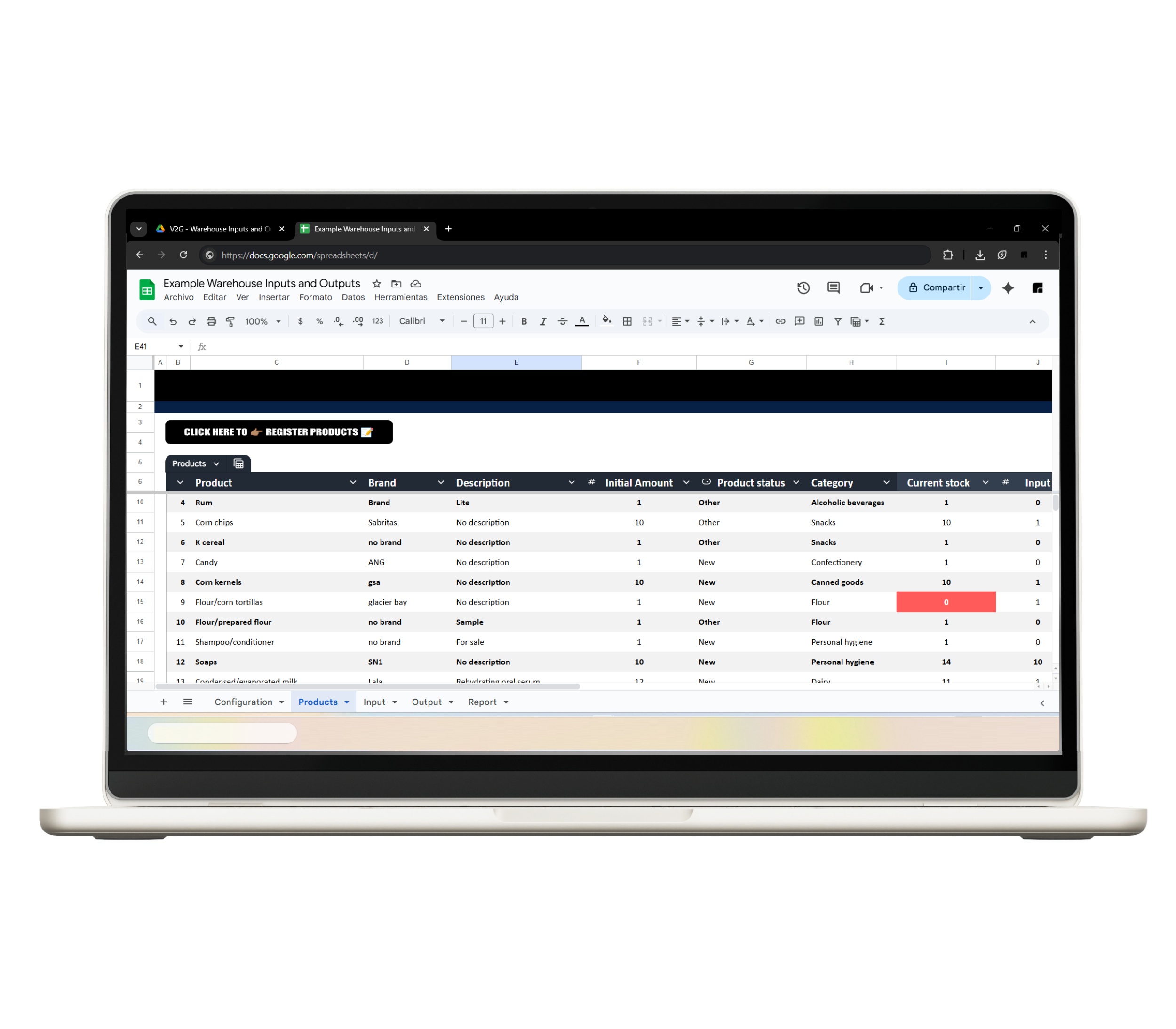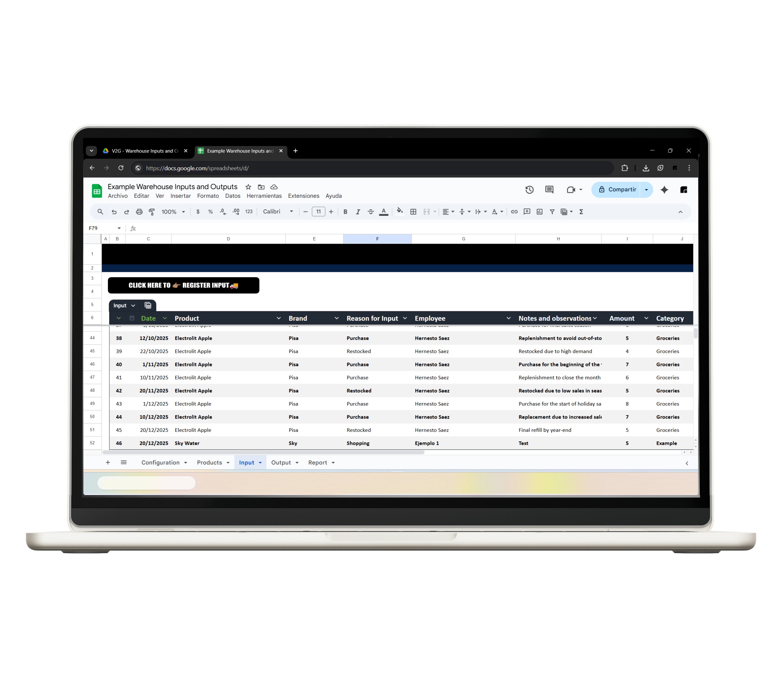 Easily set up the names of your collaborators and define product categories (e.g., raw material, finished product, tools), adapting the spreadsheet to the specific needs of your warehouse or business.